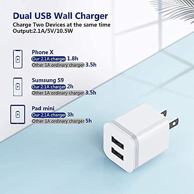 Widely Compatibility: USB Charger for Phone 13 12 11 Pro Max Xs max XR X/8/7/6/6S Plus SE 5S/5/5C, Pad, Pod, Note, HTC, LG, Motorola, Samsung Galaxy, Google Pixel and more phones. Parameter: USB Output: 2.1Amp 5V. which enables to charge your two smart phone or tablet devices simultaneously at maximum speed. Compact Design: Heat resistant and Anti-throw design, Compact and Easy to carry, Comfortable grip, Suitable use for home, travel, office, and business trip. Phone protection: Fireproof material. Charger brick has the function of automatic protection circuit. Intelligent circuit design protects against short circuiting, over-heating, over-current, and over-charging. Package includes: LUOATIP 3-Pack Dual Port USB wall charger block.