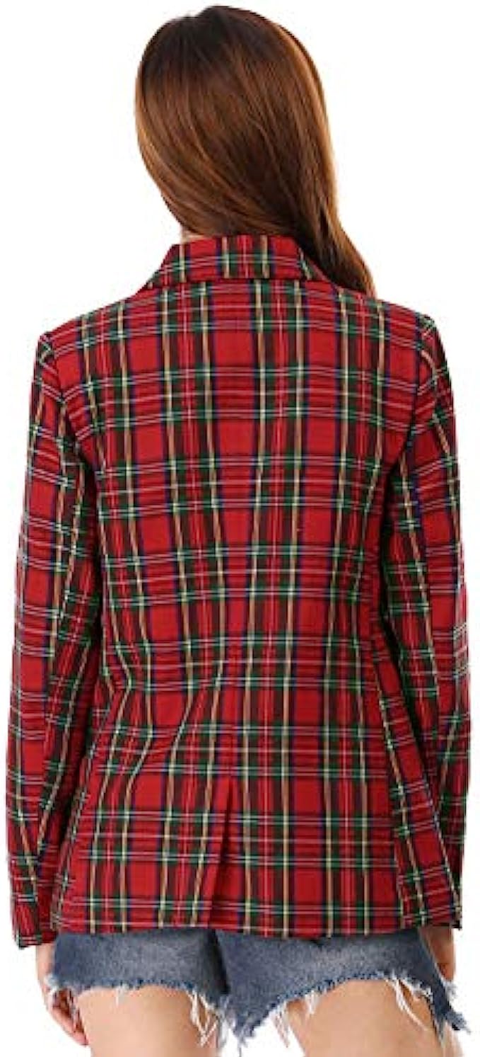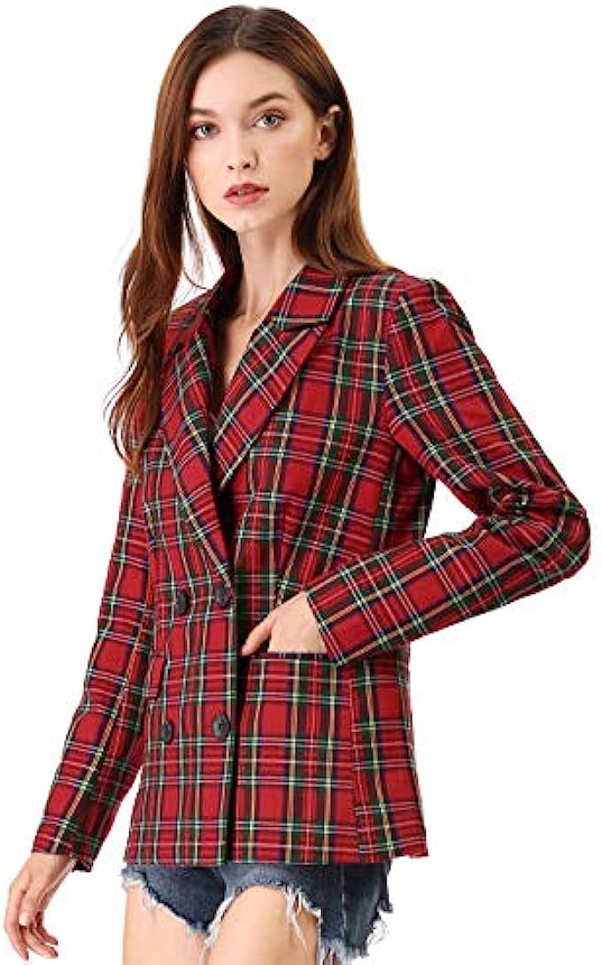 100% Polyester Double Breasted closure Machine Wash Notched Lapel Collar, Front Flap Pockets, Double Breasted Closure, Long Sleeves Padded Shoulder, Back Vent, Vintage Plaid Pattern, Fully Lined Go with midi skirts or skinny jeans suitable for work or casual everyday Occasions: Christmas Party, Office, Work, Meetings, College, Formal Ceremony, School, Casual, etc. Machine Wash with Like Color. Model is wearing in size XS (Height: 5'7", Chest: 32 1/4 inches, Waist: 24 3/8 inches, Hip: 33 7/8 inches, Weight: 99 1/4 lbs)