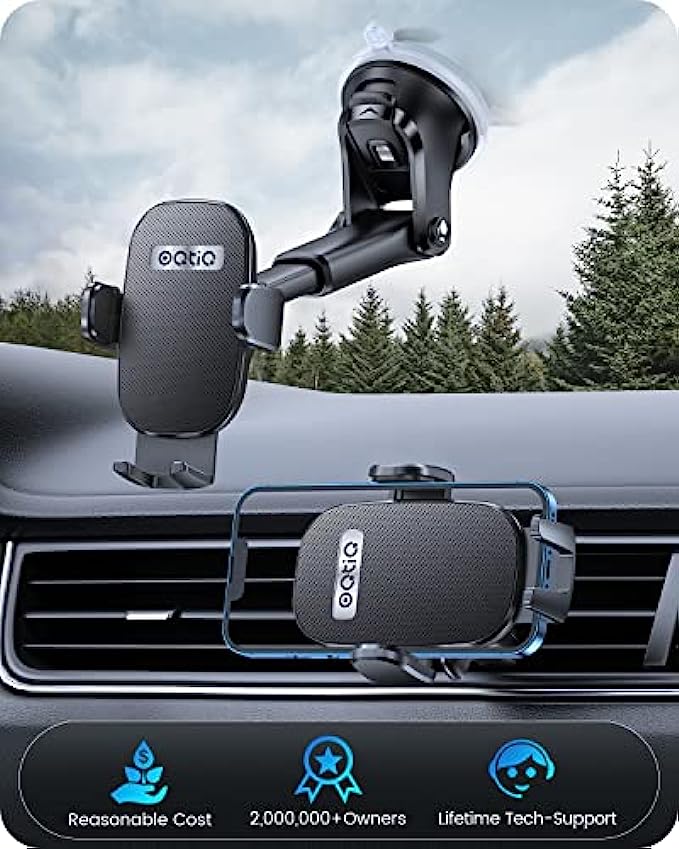 Quick One-Button Release: Just press the release button on the back of the cradle, clamp arms will smoothly slide to release your device, and you can easily take off your cellphones. Enhanced Sticky Suction Cup: Keeping the phone steady while you drive is reusable gel pads that adhere to any flat or curved portion of your dashboard, and work well in hot and cold conditions. A strong suction cup securely locks on your windshield or dashboard to keep your smartphone safe and sound while you take calls and view navigation instructions. Perfect Flexibility: Freely adjust your habitual and comfortable viewing angles due to 360 degrees of rotating ball joint. You can adjust your phone at any angle without blocking your view. With a telescopic arm, the arm can be extended from 4.2 to 5.8 inches. It’s very convenient to adjust the distance between you and the holder. Broad Compatibility: Perfect for phones(4-6.8inches). Compatible with iPhone 13/12/X/ Xs/ 8 plus/ 8/ 7 plus/ 7/ 6s plus, Samsung Galaxy S10/ S10e/ S9/ S8, Samsung note 4/5/6/7/8/9 Google Pixel 2XL, LG G6 etc. Versatile: The OQTIQ car phone holder is an affordable, multi-functional car phone holder with an air vent clip and a suction cup that you can mount on your air vent, windshield, or dashboard. If you’re looking for a car mount that offers a little something extra, the Oqtiq phone holder is an ideal choice.