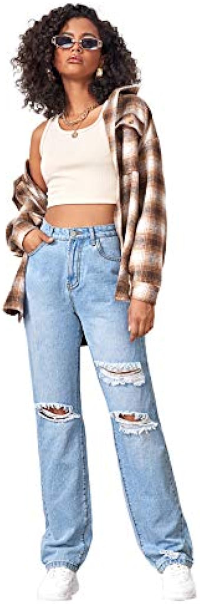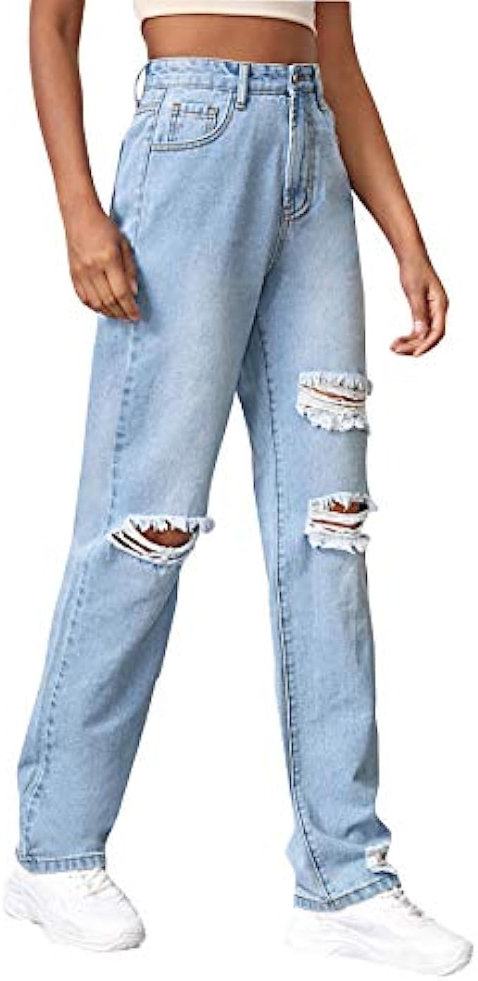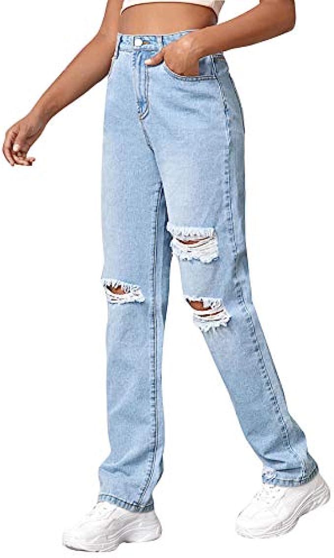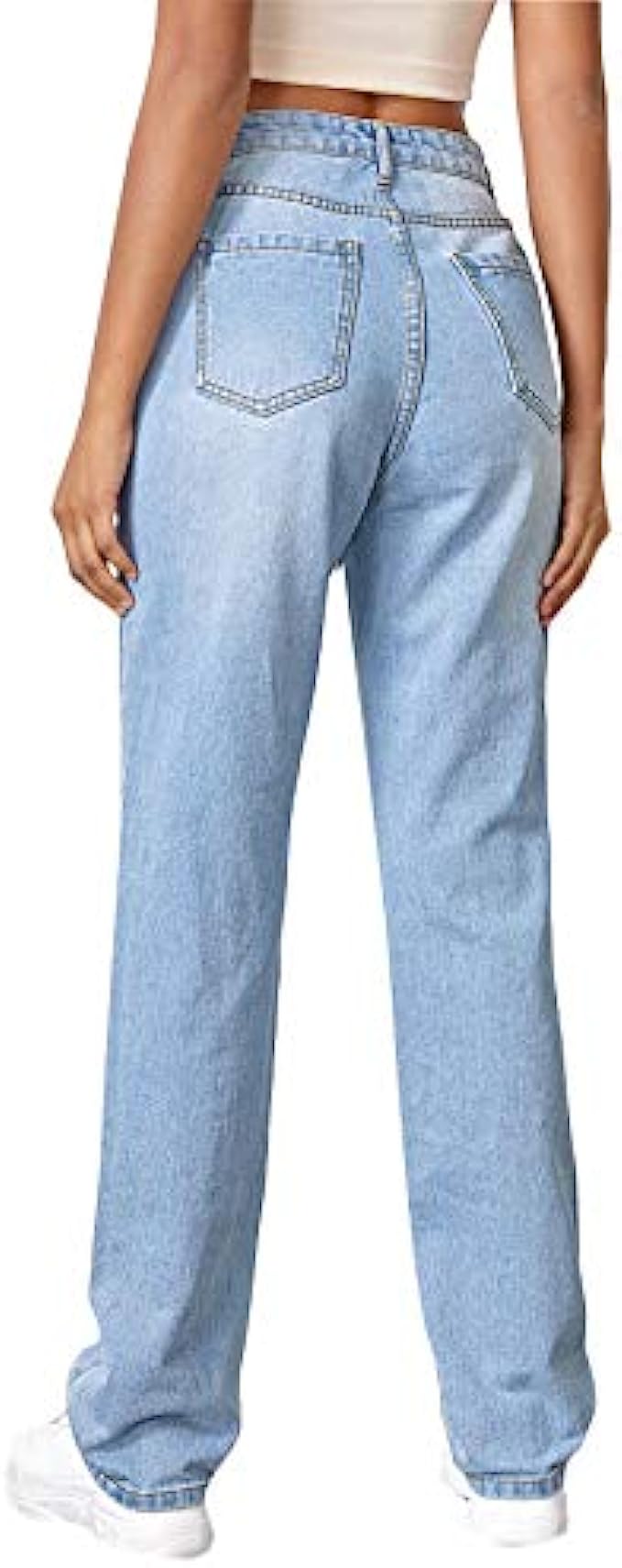 Button closure Hand Wash Only Fabric has no stretch Feature: high waist, straight leg, ripped, button, pocket, zipper Great to match with t-shirts, tank and pair with sneakers Hand wash/Machine wash; Do not bleach Please refer to the size measurement in image before ordering