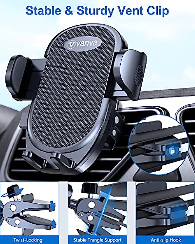 [ vanva Ultimate Car Phone Holder ] With the latest improved vent clip [Don't Slip & Drop], this car phone holder could hold your phone firmly even on the bumpiest road or sharper turn. This phone car holder is made from the most advanced durable sturdy aviation-grade materials,it is the first phone mount car to pass most extreme test on the market, making it more resistant to abrasion and corrosion. [ Screw the Vent Clamp Tightly & Secure Stable Install ] vanva car phone mount adopts the latest screw mechanial lock design which holds your phone securely to the vent. Screw the clamp and the rubber clip hook will catch one of the car air vent blades tightly, even if you hit a bump or a sharper turn. After take few seconds to install it well, which won't distract you from driving. [ Rotate Freely & Adjust Perfect Angle as You Like] Dual to the 360-degree swivel head, your phone can be rotated easily to landscape and poraits as well as anywhere in between, with the vanva car mount. This air vent car mount allow you secure your smartphone to the air vent firmly, keeping it in place whilst the optimal viewing angle. Easily lay and remove your phone using the widely comfortable phone cradle with instant release button. [ Hold Your Phone Stably & Drive without Distracting ] vanva phone mount holder has anti-slip rubber pads, stable support shelf, firm & scratch-free claw offer secure grip for your cellphone to ensure safer driving. With all above these, the stability increase 5 times, even can stable support big phones and thick cases. [ Fit Universally & Get 24 Months Worry Free Warranty ] With our car phone mount, you'll enjoy 24 months warranty. This cell phone car mount is fit for almost all phones, include iPhone 13/ 13 Pro / 13 Pro Max/ 12/12 Pro/12 Pro Max/12 Mini/SE/ 11 /11 Pro /11 Pro Max /XS / XR / XS Max / X / 8 / 8 Plus / 7 / 7 Plus / SE / 6s / 6 Plus / 6 / 5s / 5, Samsung Galaxy S10 / S10+ / S10e / S9 / S9+ / S8 / S8+ /Note 10+ /Note 10 / Note 9/Note 8/ S7 / S7 Edge / S6 S6 Edge / S5 / S4, LG, Google Pixel etc.